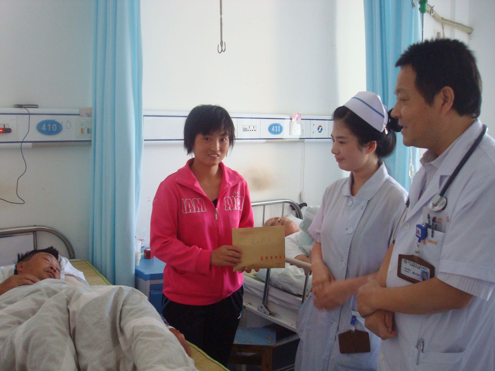 我院四病区开展爱心捐款活动9月22日上午,我院四病区的胡万华主任、狄静护士长代表科室把爱心捐款递到一位突发重症家境贫困的病人韩先生手中,尽绵薄之力帮助他早日康复。 韩先生,49岁,江西乐平人,一周前在我院诊断为脑出血、脑血管…查看详情+