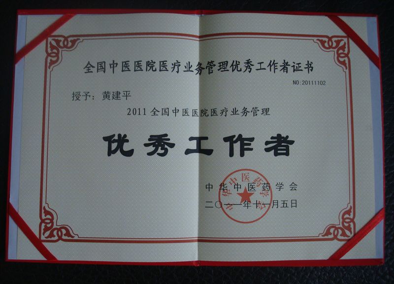 我院黄建平院长荣获"全国中医九州娱乐城 医疗业务管理优秀工作者"称号