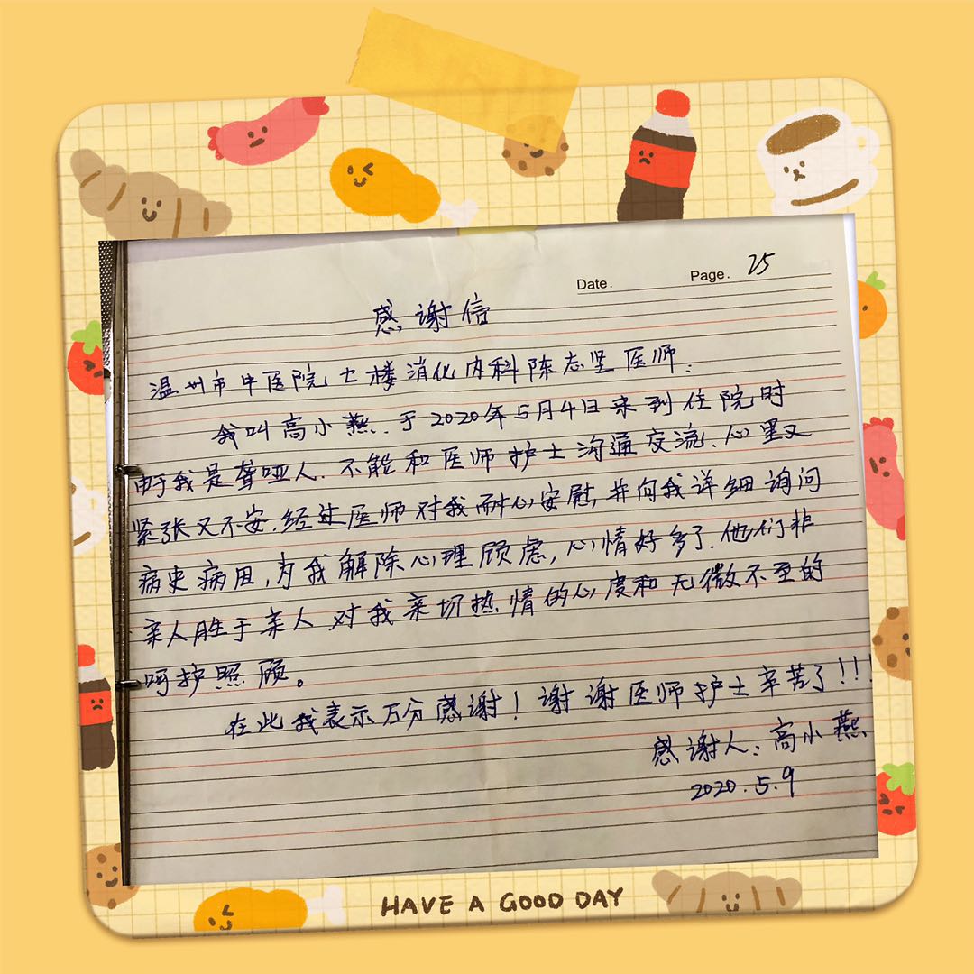 【最美中医人】暖心:一封手写的感谢信,一份聋哑病人大写的肯定“他们非亲人胜于亲人,对我亲切热情的心态和无微不至呵护照顾……”5月9日,九州娱乐城(中国)官方网站 消化内科收到一封特殊的感谢信。感谢的话语写在一张小学生的拼音纸上,文字虽短,情义却深切。 写这封感谢信的人名叫高小…查看详情+