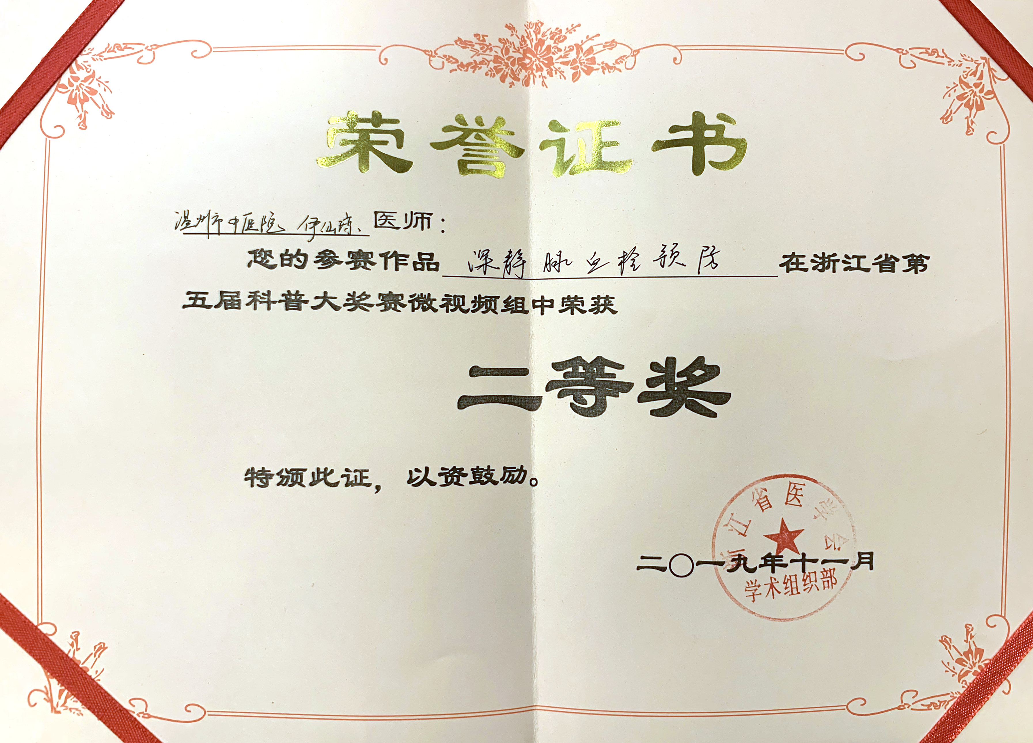 双喜临门!我院这次又捧回两个大奖!由浙江省医学会举办的浙江省第五届科普大奖赛于11月28日下午在浙江绍兴举行,我院双喜临门,康复3科的微视频作品《深静脉血栓的预防》及内分泌科制作的微视频作品《糖尿病知多少》分别取得二等奖、三等奖的佳绩。 …查看详情+