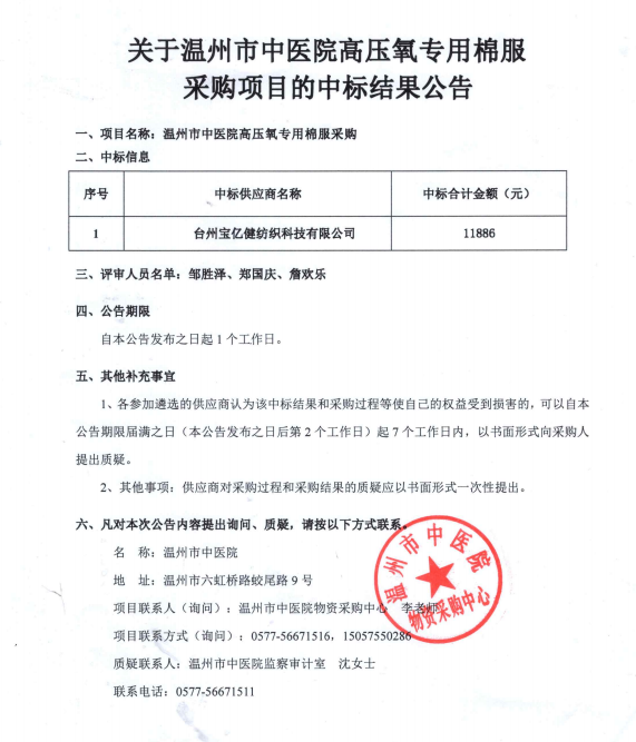 关于九州娱乐城(中国)官方网站 高压氧专用棉服采购项目的中标(成交)结果公告