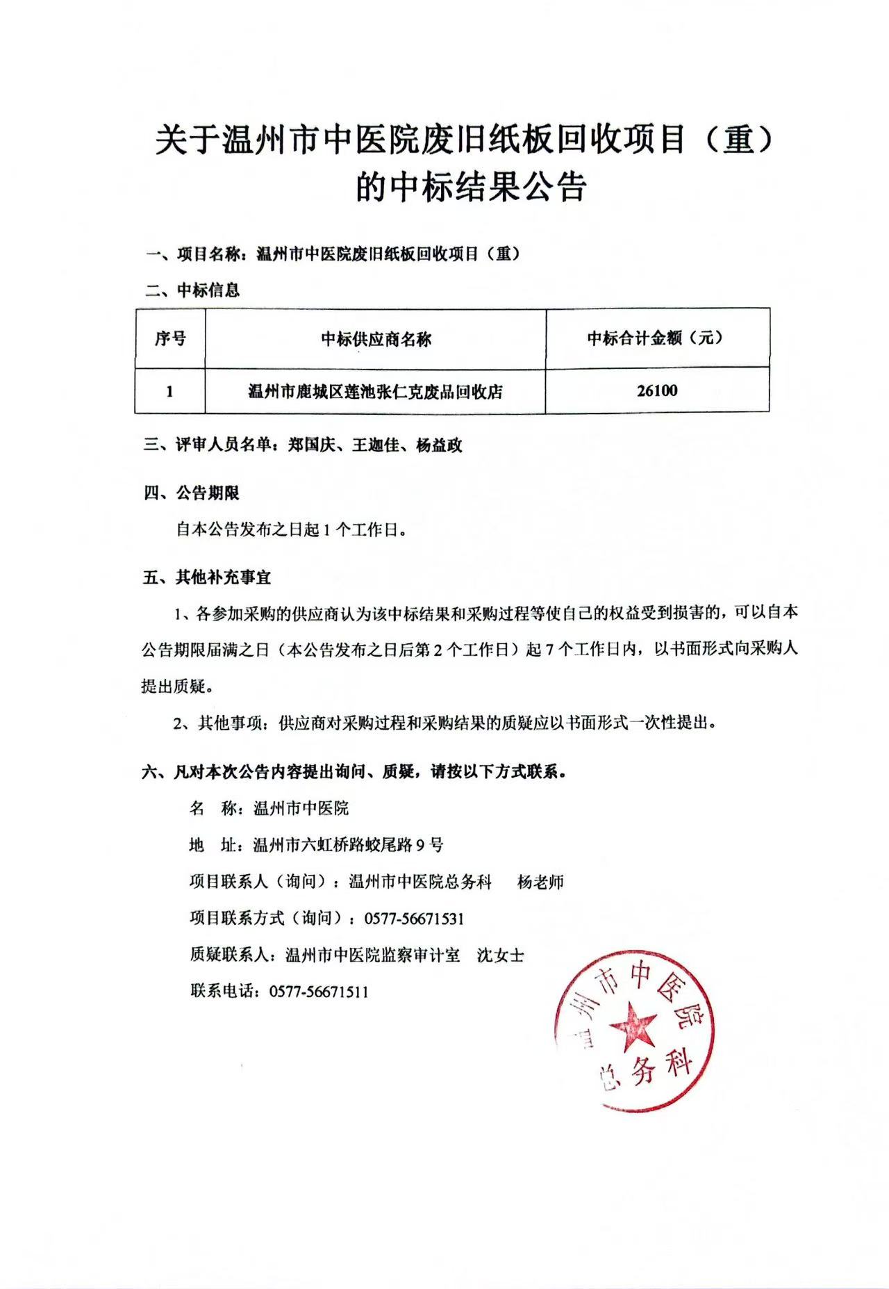 关于九州娱乐城(中国)官方网站 废旧纸板回收项目(重) 的中标结果公告