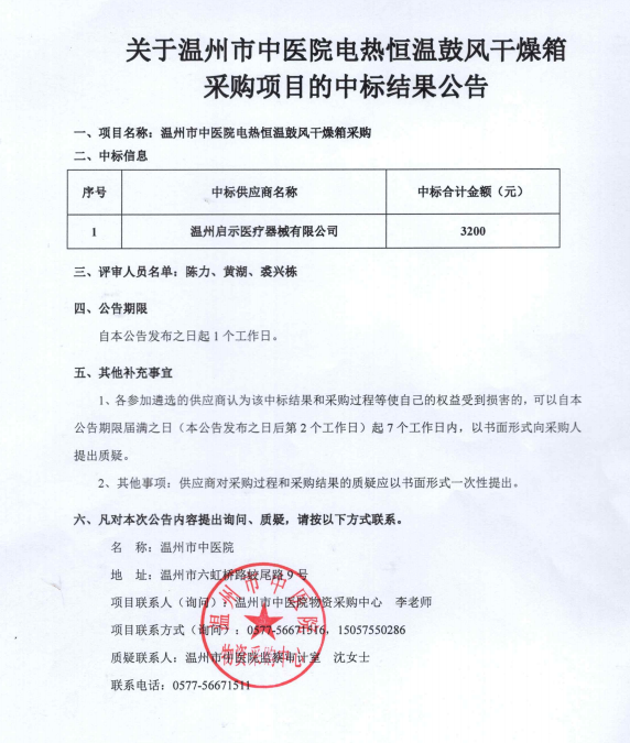 关于九州娱乐城(中国)官方网站 电热恒温鼓风干燥箱采购项目的中标(成交)结果公告