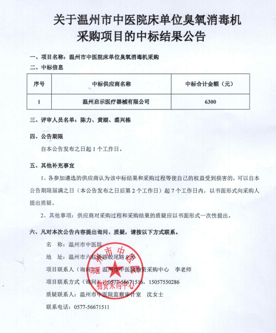 关于九州娱乐城(中国)官方网站 床单位臭氧消毒机采购项目的中标(成交)结果公告