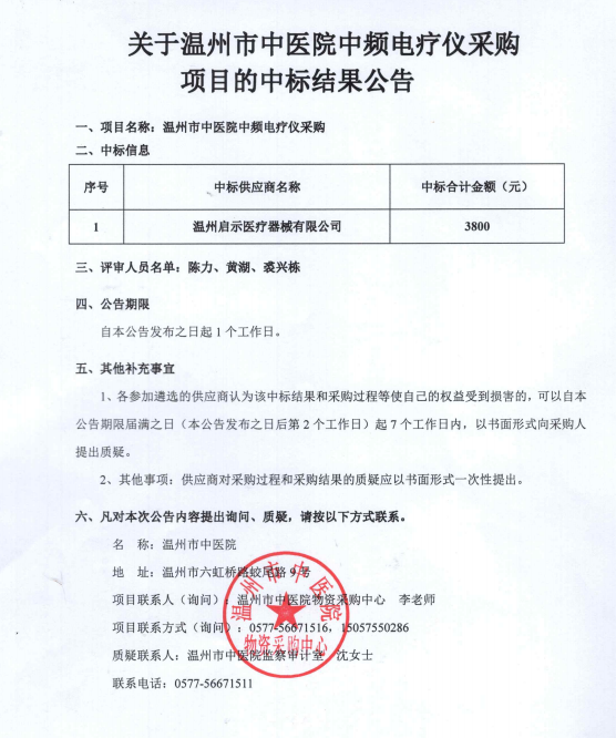 关于九州娱乐城(中国)官方网站 中频电疗仪采购项目的中标(成交)结果公告