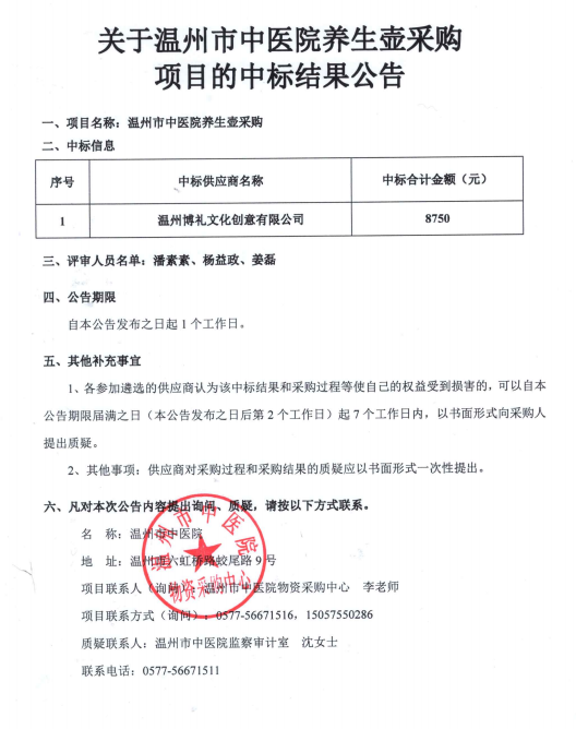 关于九州娱乐城(中国)官方网站 养生壶采购项目的中标(成交)结果公告