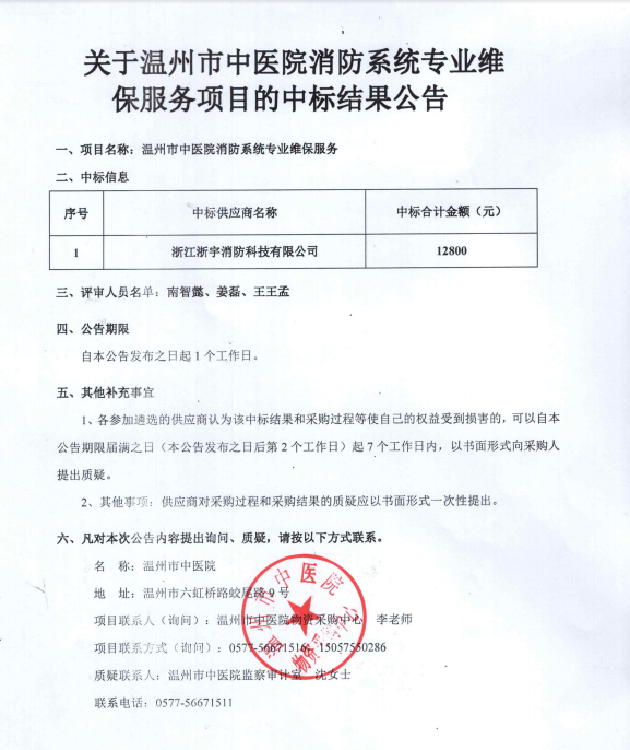 关于九州娱乐城(中国)官方网站 消防系统专业维保服务项目的中标(成交)结果公告
