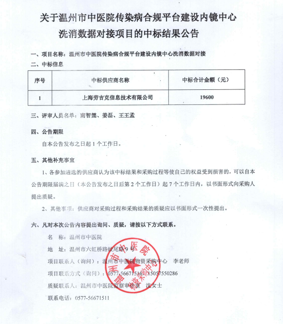 关于九州娱乐城(中国)官方网站 传染病合规平台建设内镜中心洗消数据对接项目的中标(成交)结果公告