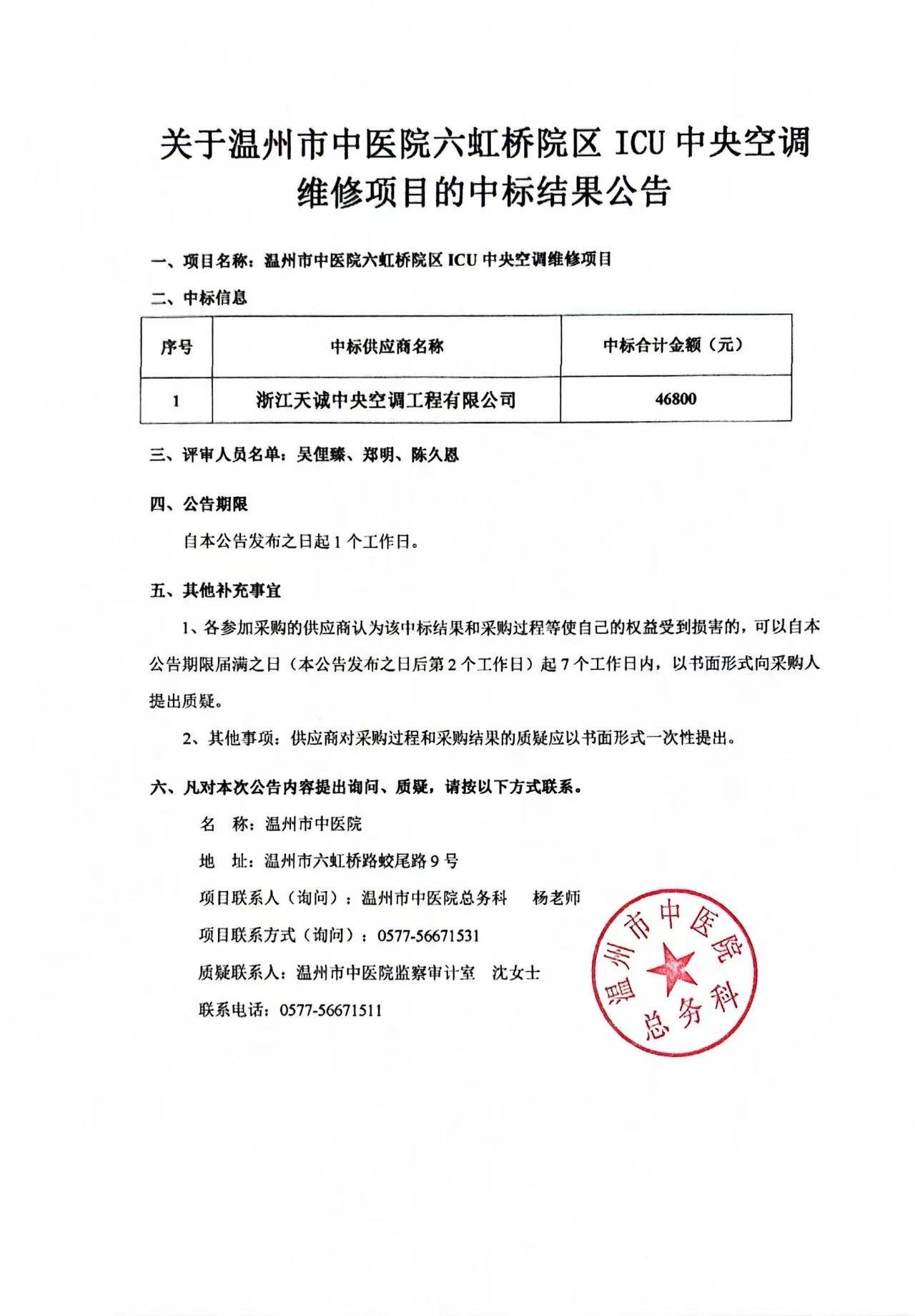 关于九州娱乐城(中国)官方网站 六虹桥院区ICU中央空调维修项目的中标结果公告