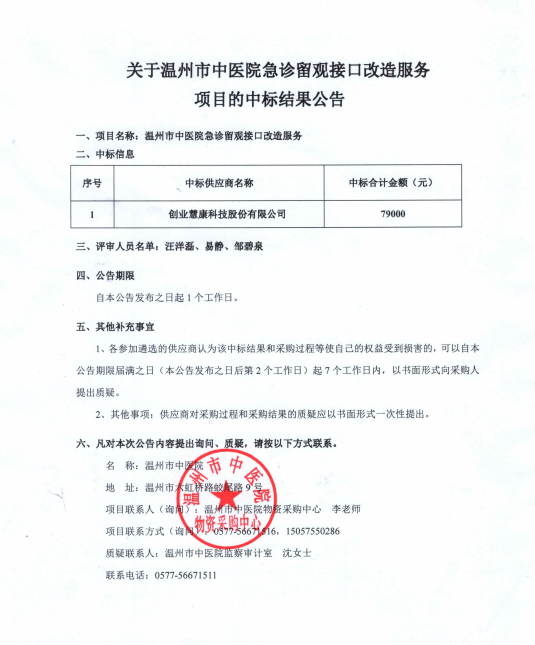 关于九州娱乐城(中国)官方网站 急诊留观接口改造服务(重)项目的中标(成交)结果公告