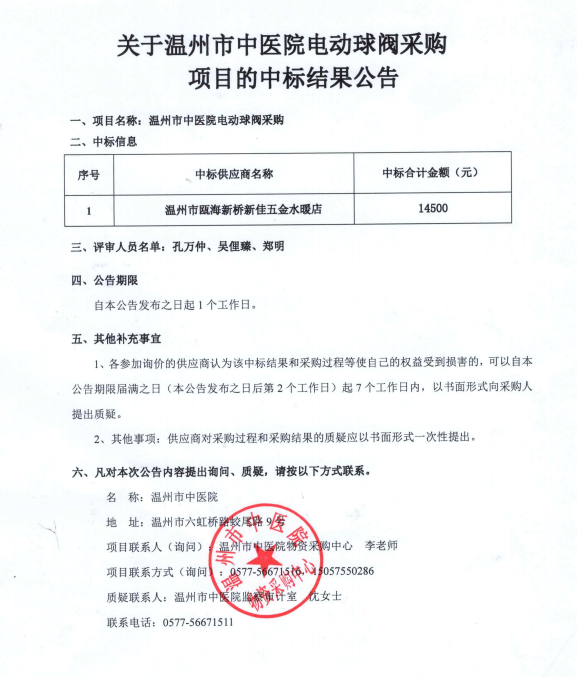 关于九州娱乐城(中国)官方网站 电动球阀采购项目的中标(成交)结果公告