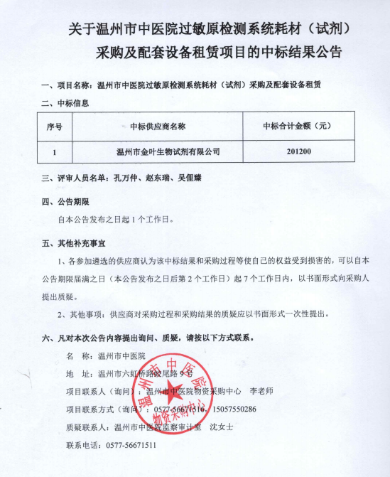 关于九州娱乐城(中国)官方网站 过敏原检测系统耗材(试剂)采购及配套设备租赁项目的中标(成交)结果公告