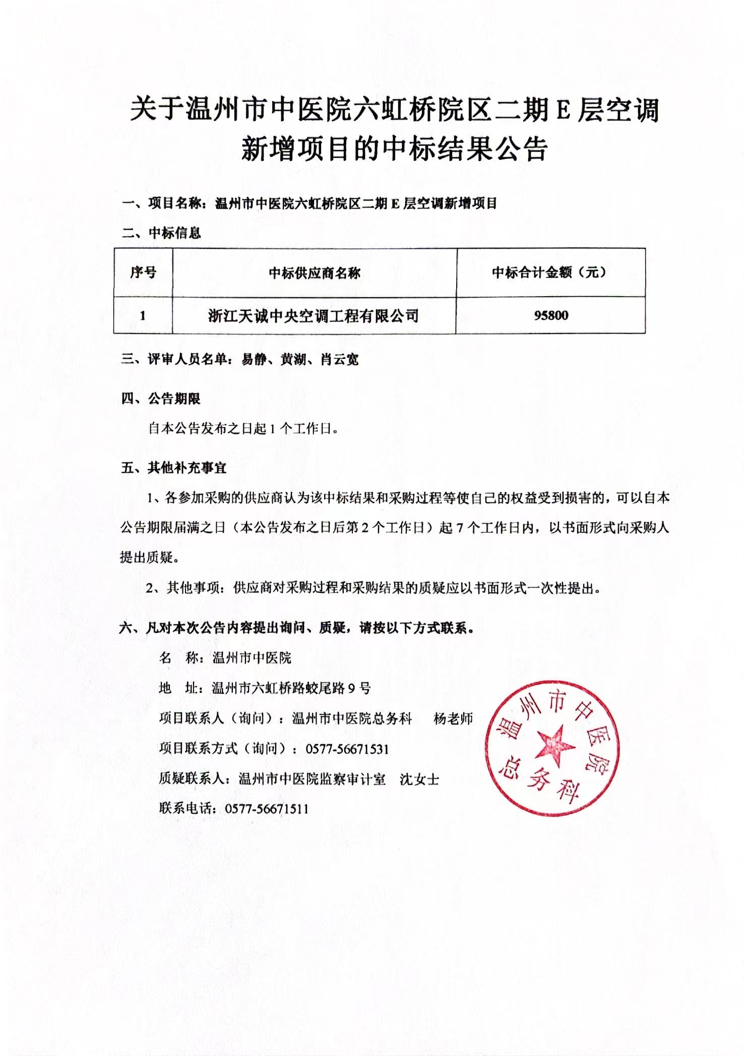 关于九州娱乐城(中国)官方网站 六虹桥院区二期E层空调新增项目的中标结果公告