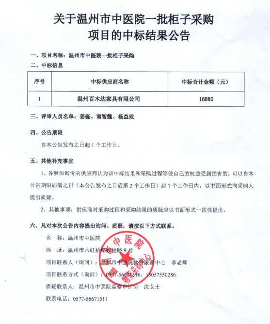 关于九州娱乐城(中国)官方网站 一批柜子采购项目的中标(成交)结果公告