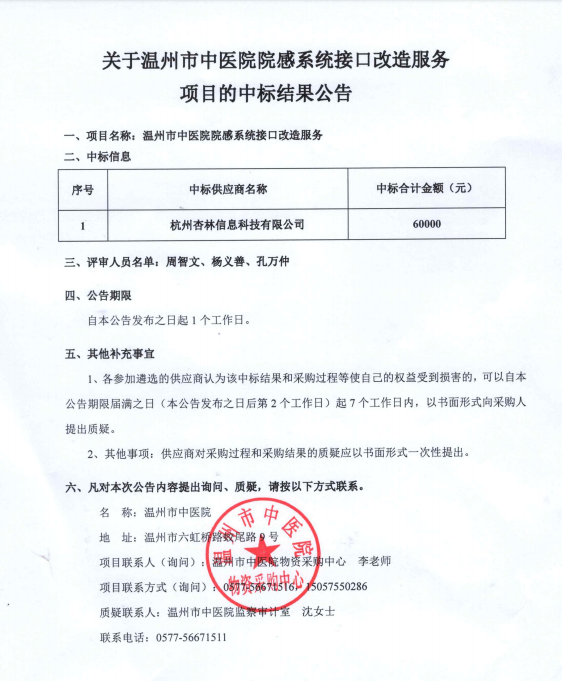 关于九州娱乐城(中国)官方网站 院感系统接口改造服务项目的中标(成交)结果公告