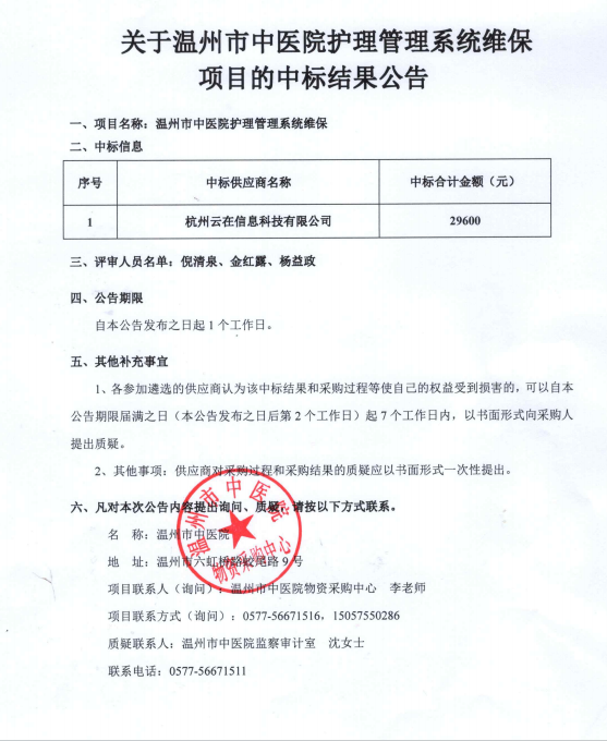 关于九州娱乐城(中国)官方网站 护理管理系统维保项目的中标(成交)结果公告