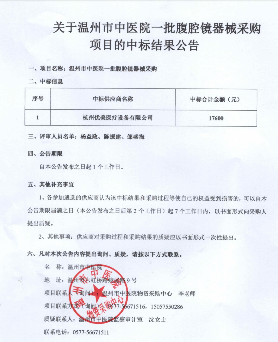 关于九州娱乐城(中国)官方网站 一批腹腔镜器械采购项目的中标(成交)结果公告