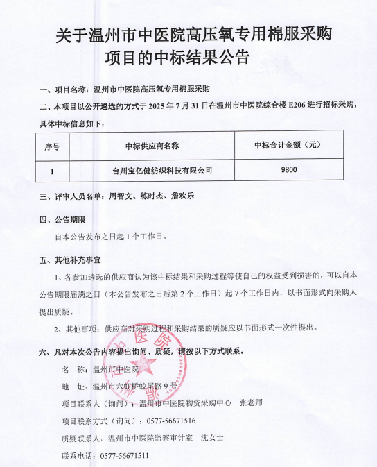 关于九州娱乐城(中国)官方网站 医用织物项目的中标结果公告一、项目编号:WZZF2025(FZC)-06-110(GK)二、项目名称:医用织物三、中标(成交)信息 1.中标结果:序号中标(成交)金额(元)中标供应商名称中标供应商地址1投标报价:129880(元)台州宝亿健纺…查看详情+