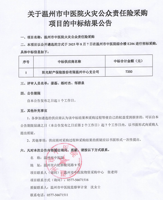 关于九州娱乐城(中国)官方网站 火灾公众责任险采购项目的中标(成交)结果公告