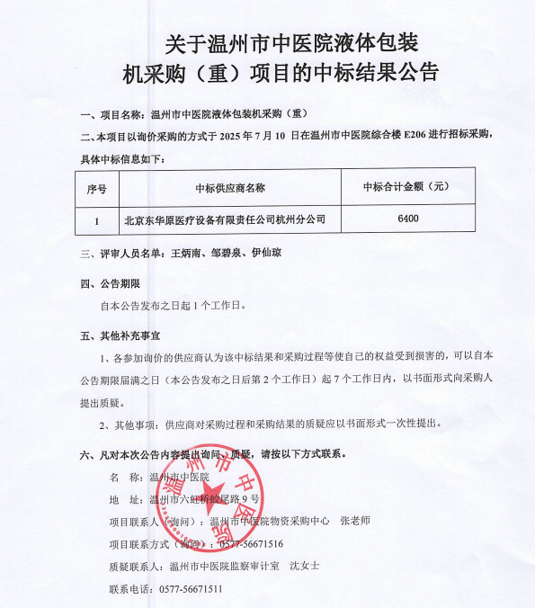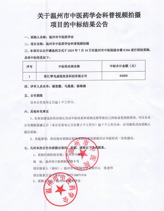 关于温州市中医药学会科普视频拍摄项目的中标(成交)结果公告