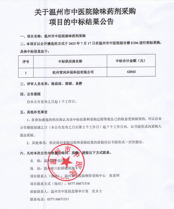 关于九州娱乐城(中国)官方网站 除味药剂采购项目的中标(成交)结果公告