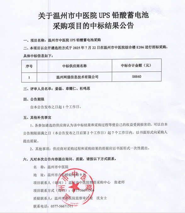 关于九州娱乐城(中国)官方网站 UPS铅酸蓄电池采购项目的中标(成交)结果公告