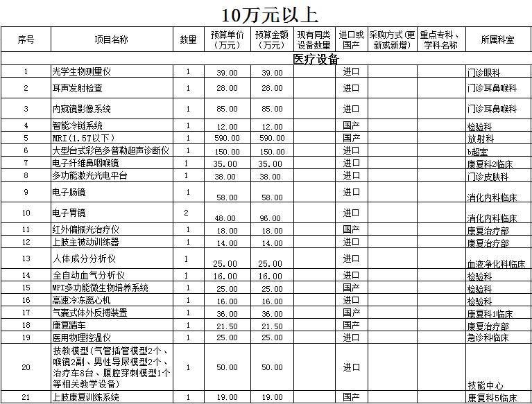 九州娱乐城(中国)官方网站 2021年医疗设备采购计划