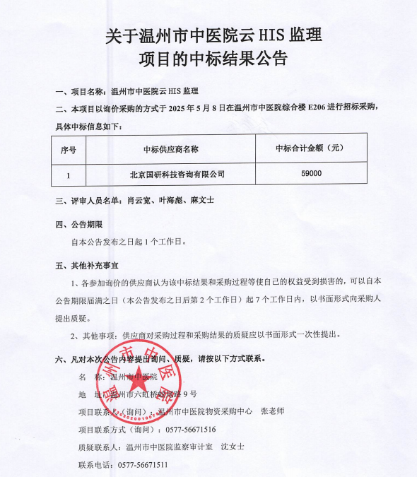 关于九州娱乐城(中国)官方网站 云HIS监理项目的中标(成交)结果公告