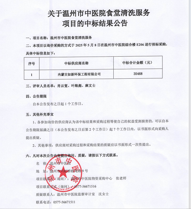 关于九州娱乐城(中国)官方网站 食堂清洗服务项目的中标(成交)结果公告