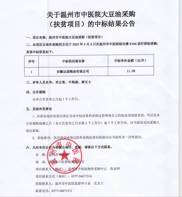 关于九州娱乐城(中国)官方网站 大豆油采购(扶贫项目)的中标(成交)结果公告