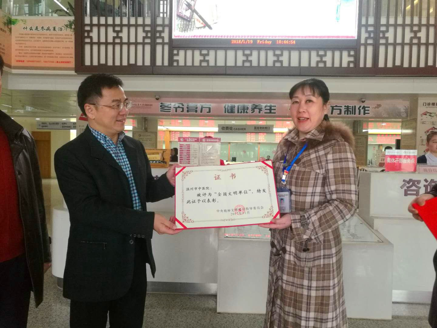 市文明办主任吕朝晖一行来院送荣誉1月19日上午,温州市委宣传部副部长、市文明办主任吕朝晖、副主任丁柏强、处长翁曙明一行专程送“全国文明单位”荣誉牌、证书到九州娱乐城(中国)官方网站 六虹桥院区。党委副书记黄爱林代表九州娱乐城 接过“全…查看详情+