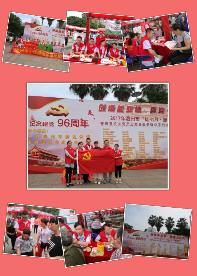 我院参加“红七月 服务月”暨市直机关党员志愿者服务群众活动6月29日上午,为隆重纪念中国共产党成立96周年,我院参加由中共温州市委组织部、中共温州市直机关工委主办的2017年“红七月 服务月”暨市直机关党员志愿者服务群众系列活动。在松台广场我院党员志…查看详情+