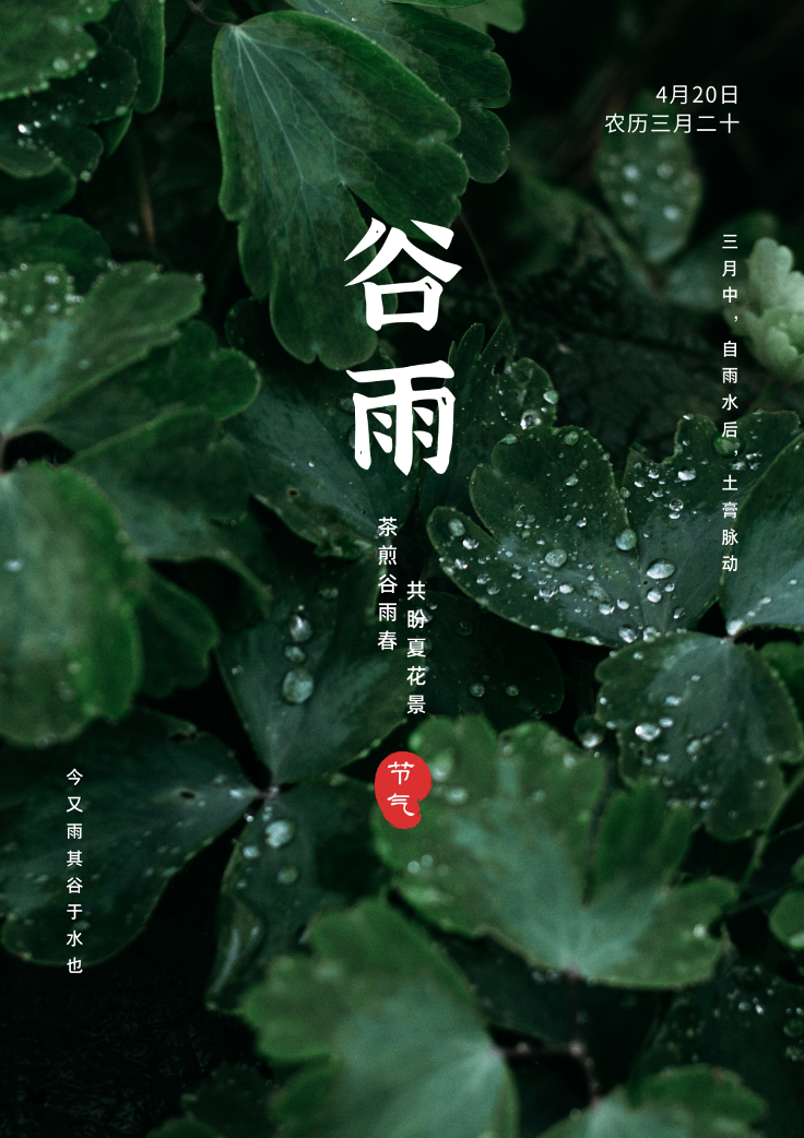 谷雨|春光晓,山川黛色青谷雨,是春季的最后一个节气,于每年公历4月19日—21日交节,这时田中秧苗初插、作物新种,最需要雨水的滋润,所以又有“春雨贵如油”的美誉。《月令七十二候集解》云: “三月中,自雨水后,土膏脉动,今又雨其谷于水…查看详情+
