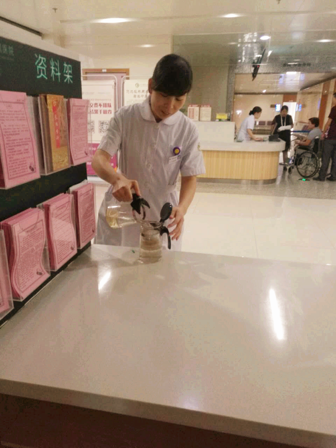 为了能使门诊医生安心为病人诊治,分诊人员每天主动为出诊的医生倒好茶水,中午为无法按时下班的医生送上一份暖暖的饭菜,同时还准备了门诊医生诊间休息室,让稍有空闲的医生们能在休息室内享受点心、饮品,得到片刻放松。