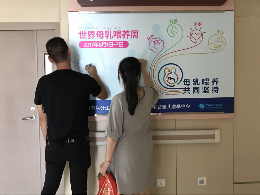 1、准爸爸和准妈妈在母乳喂养宣传栏上签名,支持母乳喂养;