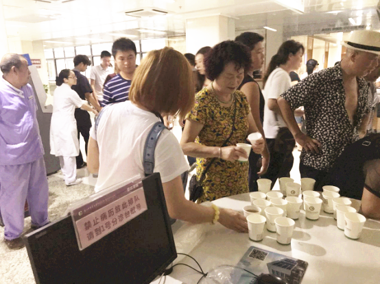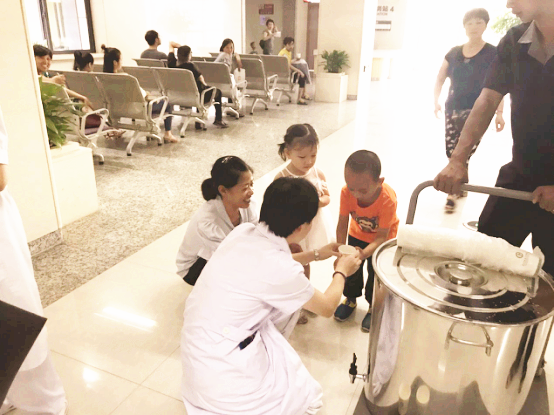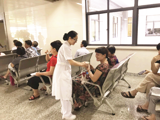 8点30分,九州娱乐城 食堂将茯茶送至门诊大厅,门诊护士和物业人员为候诊、候药、候检的患者送上一杯杯伏茶,缓解天气所带来的炎热、烦躁。此举得到了广大患者及家属的称赞,纷纷向门诊及物业人员表达感谢之情。