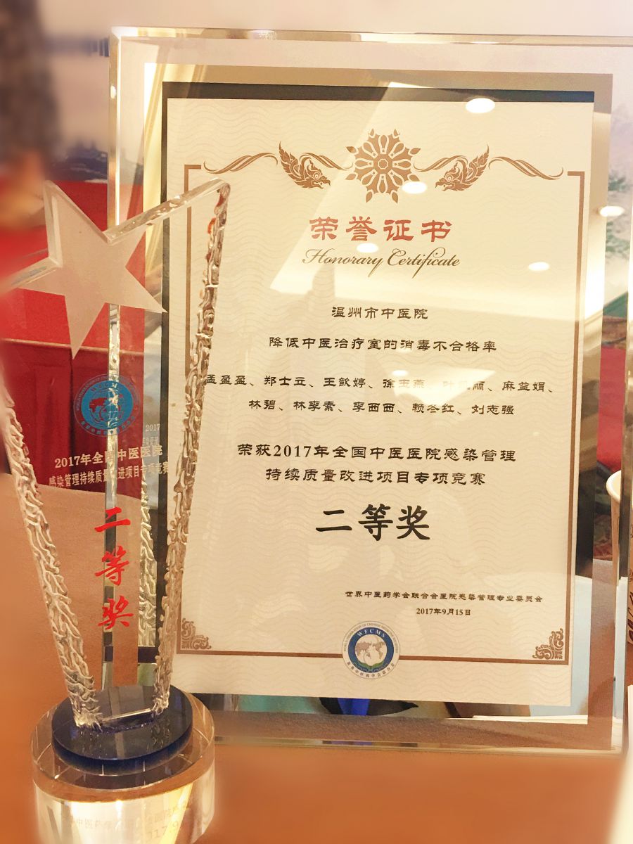 我院感染管理科推送了由针推科医护团队联合消毒供应中心共同完成的《降低中医治疗室消毒不合格率》QCC项目,其主要内容为针推科所有玻璃罐统一送至消毒供应中心集中清洗消毒处理,使玻璃罐消毒得到流程改进和设施改善及评价优化,同时中医治疗室环境清洁消毒、患者皮肤消毒、医护人员手卫生、医疗废物的管理等都得到明显提升。此项目在浙江省中医感染管理PDCA竞赛中成绩突出,不仅入选全国赛,还获得现场汇报资格。在决赛中针推科护士长孟盈盈和护士叶凯丽的亮眼表现、优美的原创歌曲《感控卫士》以及团队项目显著改进成果获得了评委的一致好评,最终荣获全国中医九州娱乐城 感染管理专项竞赛二等奖。