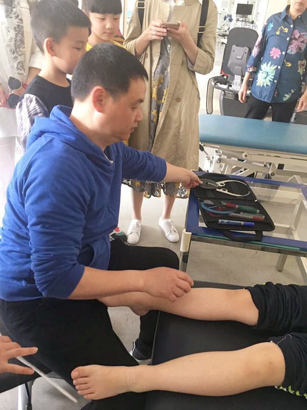 最后,康复治疗部主管技师章国伟为部分同学进行了脊柱测弯检测及足形的生长情况。