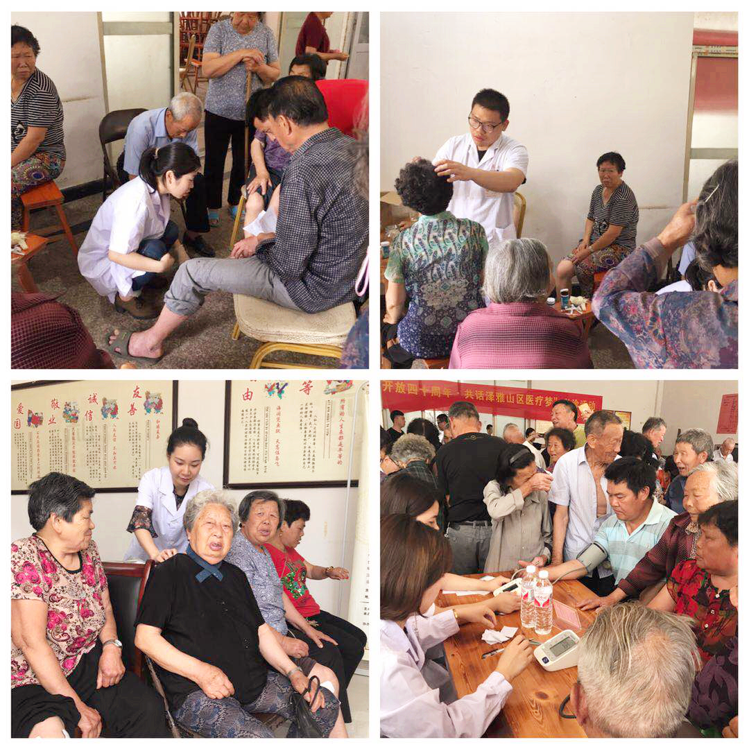 (为村民们进行针灸、拔罐、理疗、测血压)