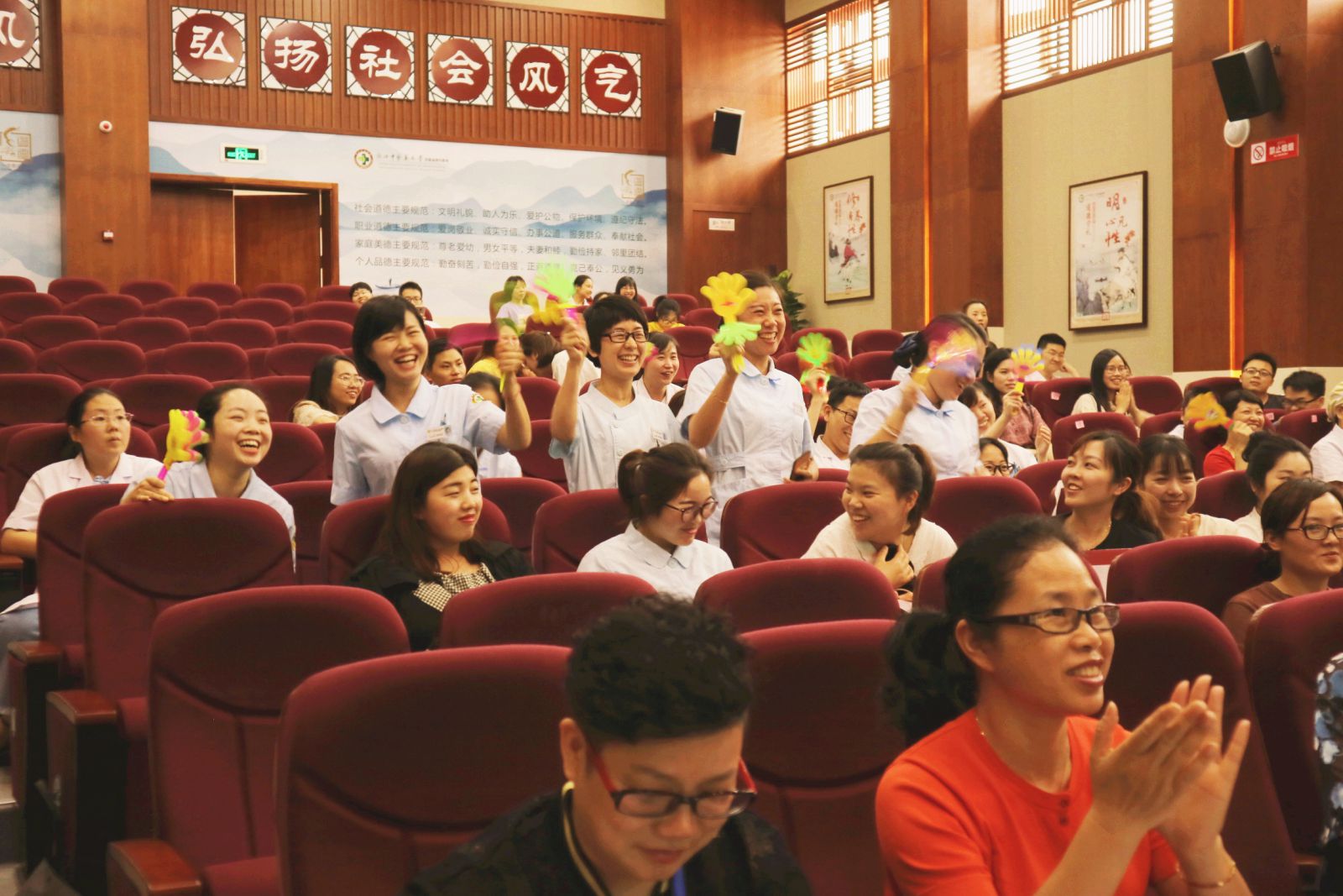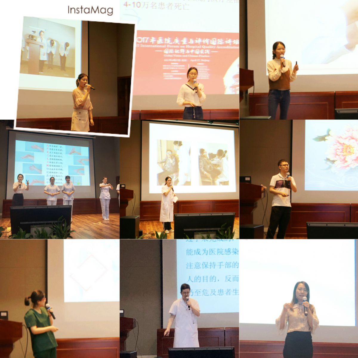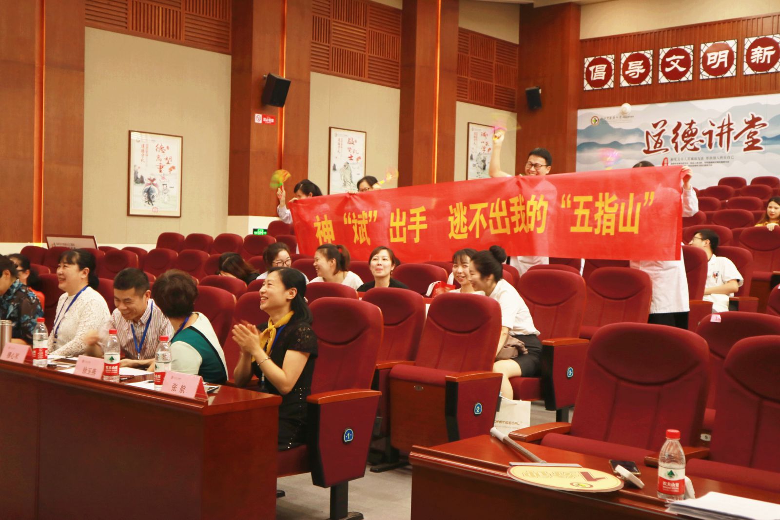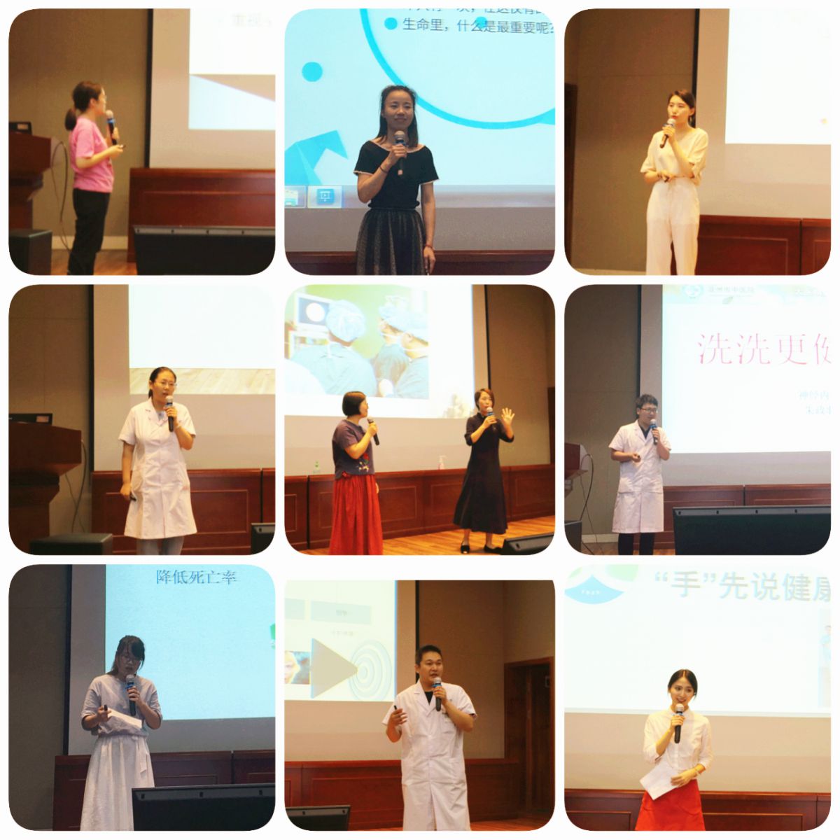 消化科何璠医师演讲抑扬顿挫,一首手卫生之歌让大家耳目一新;神内2科黎斌的《五指山下的纷争》在他形象的故事表演中“尘埃落定”;大士门针推科的团队作战脱颖而出;《心如镜、净如镜》中黄盈护士的娓娓道来让人为之动容;外科2陆月仙、赵玲玲的对口相声《缺一不可》活泼生动;外科3叶海东主任代表科室亲自上场表达了关注手卫生的决心。