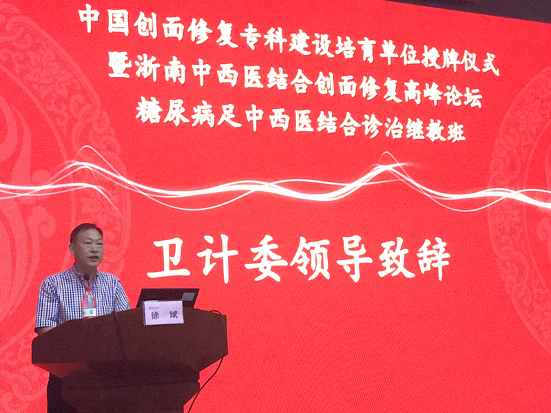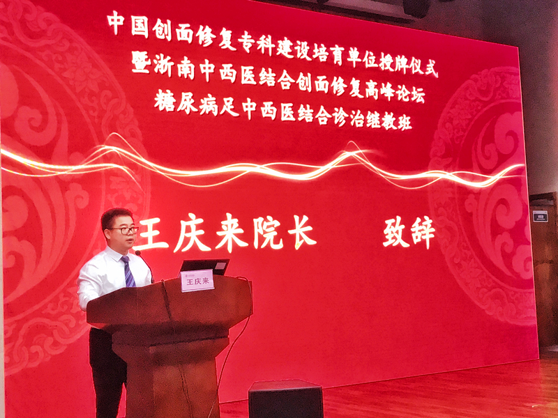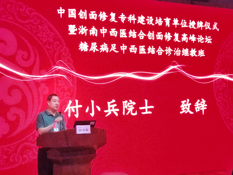 王庆来院长在致辞中对与会的领导、嘉宾和来自各地的医疗同仁表示欢迎,并简要介绍了我院的发展情况和此次授牌仪式的背景;徐斌副书记在致辞中简要介绍了我市卫生工作情况,还对创伤医学和“中国创伤救治联盟”成立的背景作了解读,并对参会的我市医务工作者提出了期望;李校堃校长介绍了温州医科大学近几年的发展概况以及温州医科大学与付小兵院士的合作历程。付小兵院士为参会同仁们讲解了《中国创面修复专科建设1239三年行动》。在授牌仪式上,付小兵院士为我院颁发了“中国创面修复专科建设培育单位”牌匾,王庆来院长代表九州娱乐城 接牌,标志着我院正式成为中国创面修复专科建设培育单位。