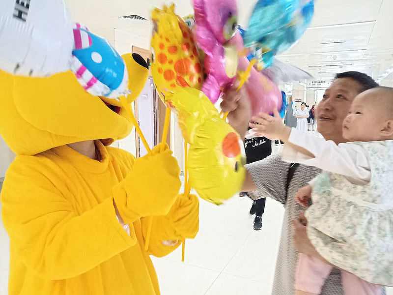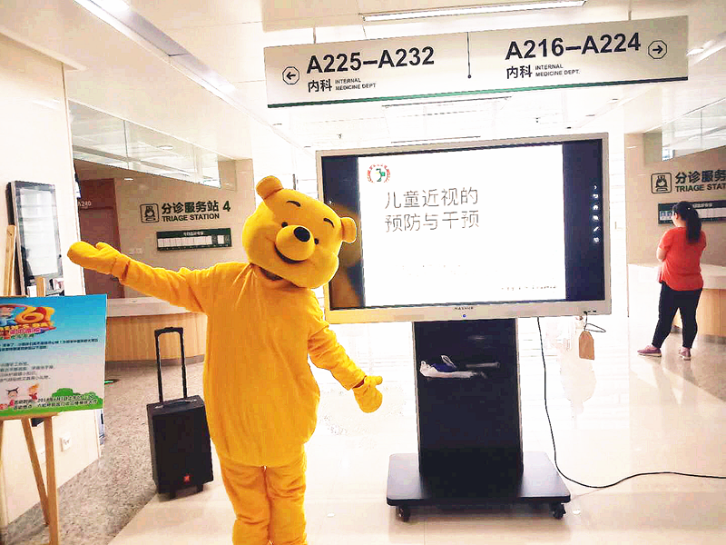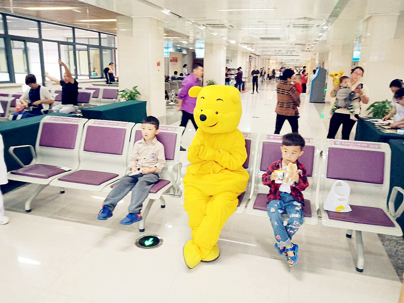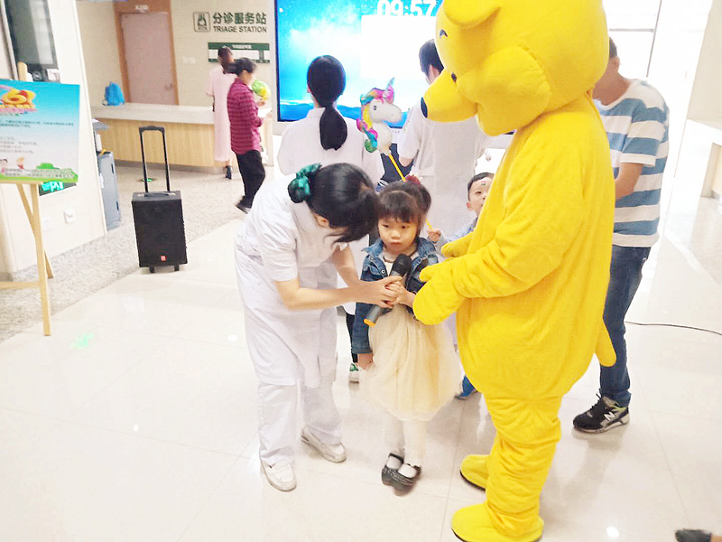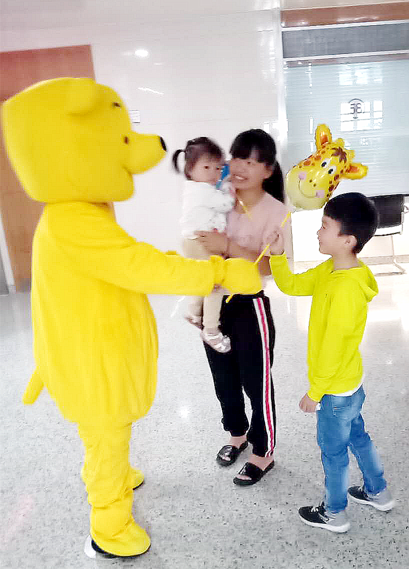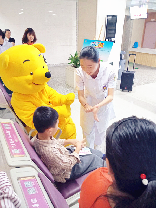 6月1日上午,我院六虹桥院区门诊大厅内,门诊护士扮演的可爱维尼熊给生病的小朋友们带来了“六一儿童节”的礼物,并送上节日的祝福,祝愿小朋友们健康成长。