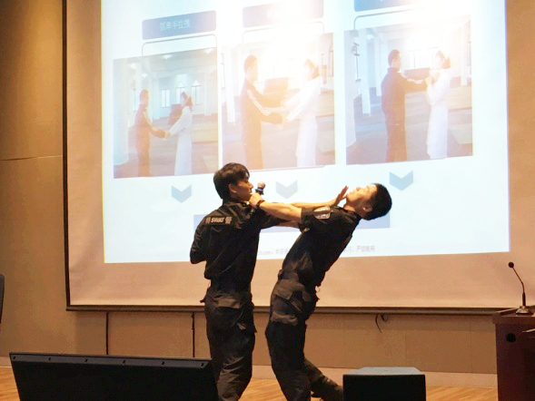 讲座上,赵指导利用一个个真实的案例视频,开展案情分析。告知医护人员树立正确的预防心理,对周围的环境有足够的防范意识,做好正当防卫,以巧制胜。随后,为医护人员悉心讲解并演示了实用、简易的防卫术,医护人员现学现卖,热情高涨的开展互动防卫,气氛十分融洽。