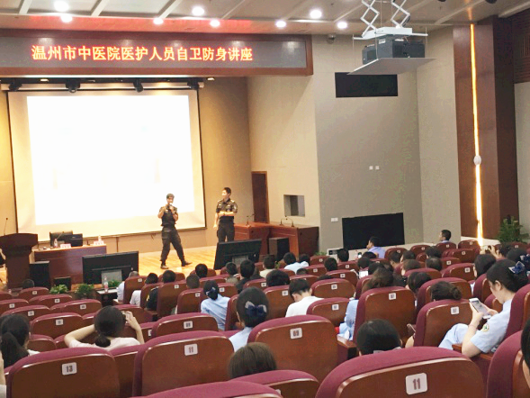 为提高我院医务人员对突发暴力事件的应对能力,增强自我防护能力,保障医疗安全。2018年7月26日下午,在六虹桥院区综合楼8楼会议室,我院特邀温州公安局特警支队三中队赵明峰指导员为医护人员及安保人员开展“九州娱乐城(中国)官方网站 医护人员自卫防身”讲座。麻瑞龙副院长主持会议。