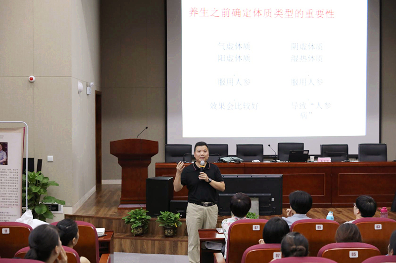 朱文宗副院长以体质的概念为切入点,阐述了中医体质学说的根源和根据体质养生的必要性,介绍了阳虚质、阴虚质、气虚质等9种不同的体质,分别描述了每种体质的特点和行为表现,还对如何辨别判定自己的体质作了详细的讲解,帮助学员们自我辨识;针对常见的偏颇体质,朱文宗副院长教授了相应的饮食、作息、运动等调理方法;朱文宗副院长还为学员们讲解了每种体质的养生原则和方法,内容通俗易懂,受到学员们的一致好评。课程结束后,学院还安排了医护人员为到场的学员提供血糖,血压测量,健康咨询等项目,并分发了中医药特色小礼品。